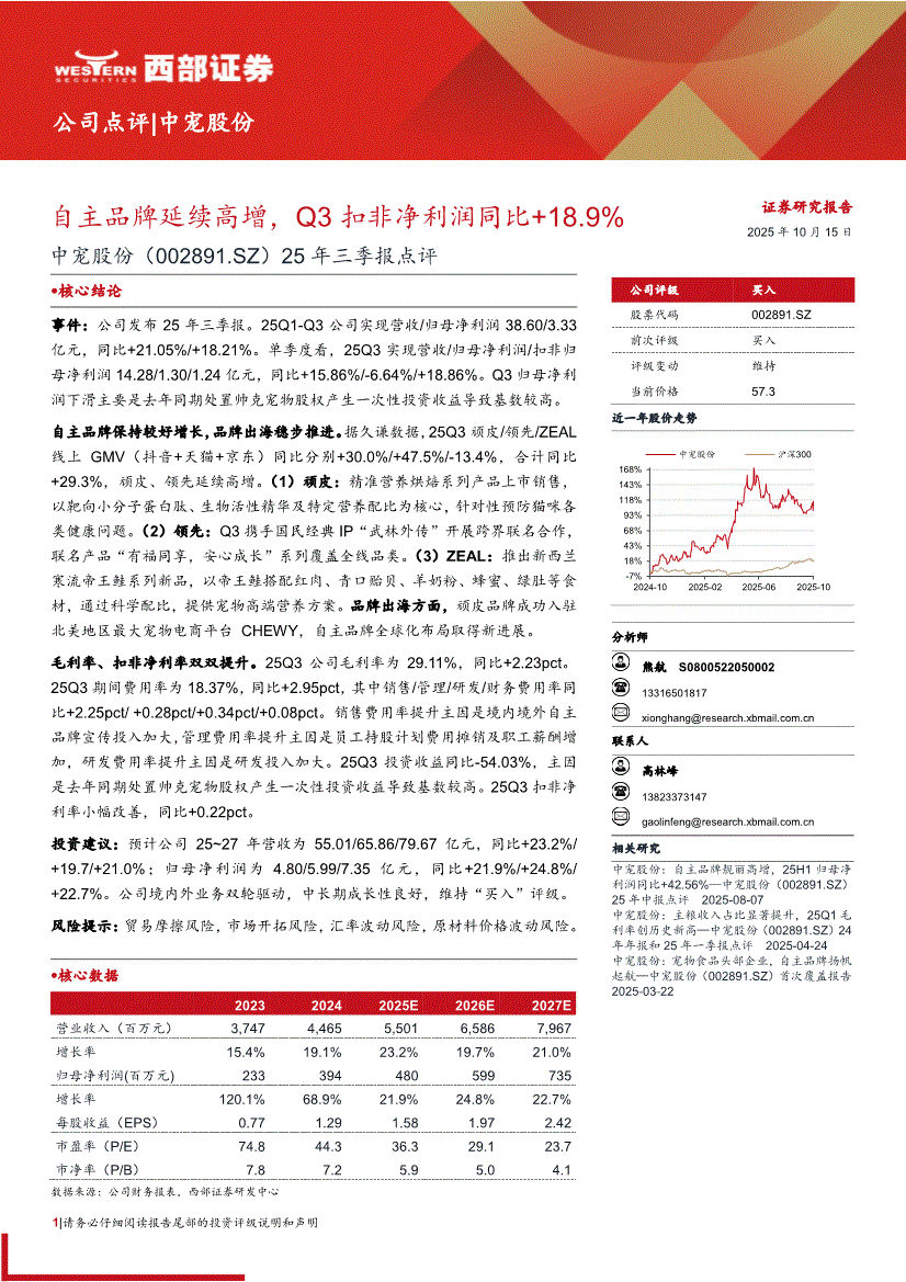 中宠股份:西部证券-中宠股份-002891-25年三季报点评:自主品牌延续高增,Q3扣非净利润同比+18.9%-251015