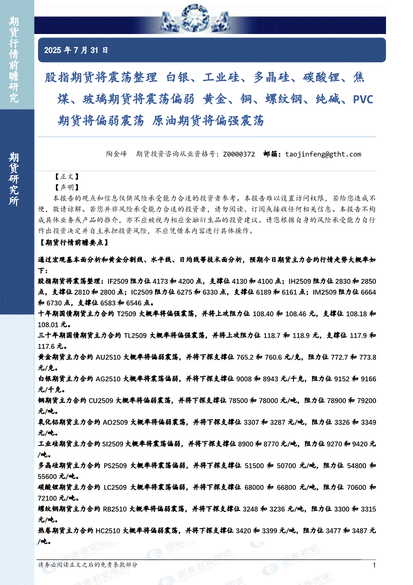 国泰君安期货-股指期货将震荡整理,白银、工业硅、多晶硅、碳酸锂、焦煤、玻璃期货将震荡偏弱,黄金、铜、螺纹钢、纯碱、PVC期货将偏弱震荡,原油期货将偏强震荡-250731