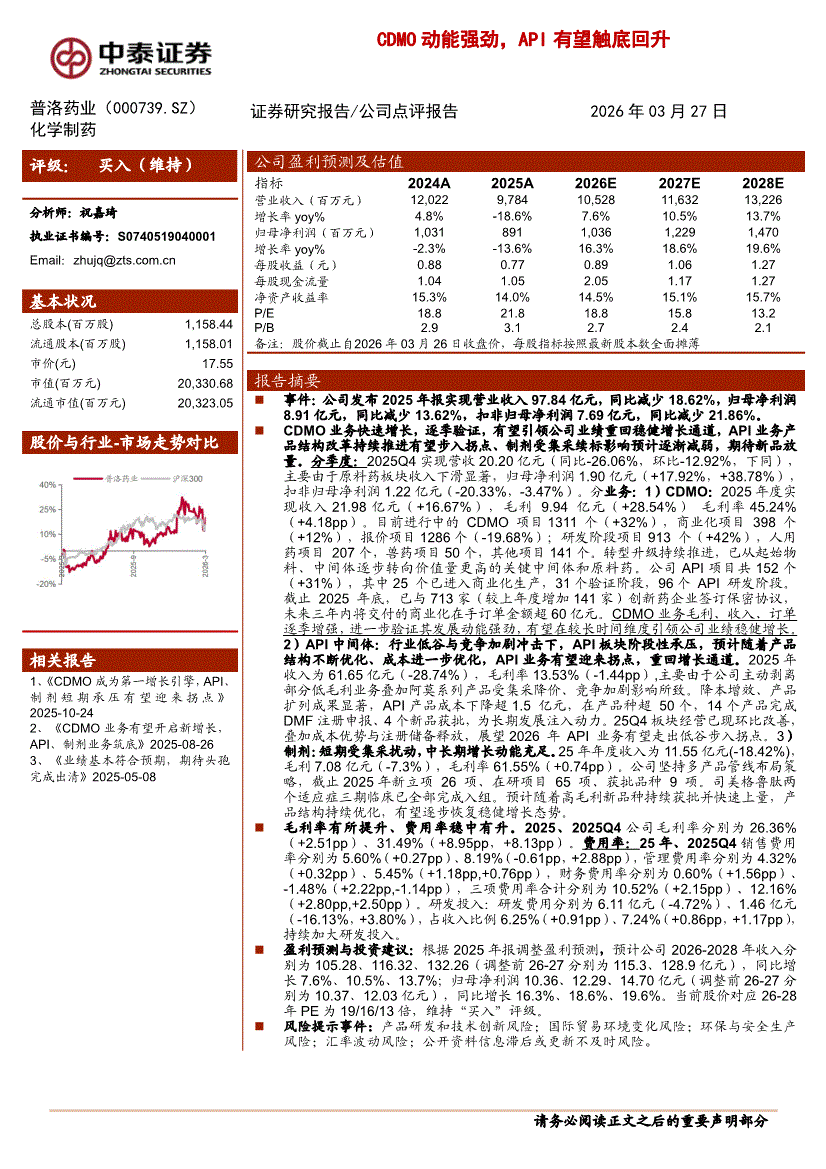 普洛药业:中泰证券-普洛药业-000739-CDMO动能强劲,API有望触底回升-260327