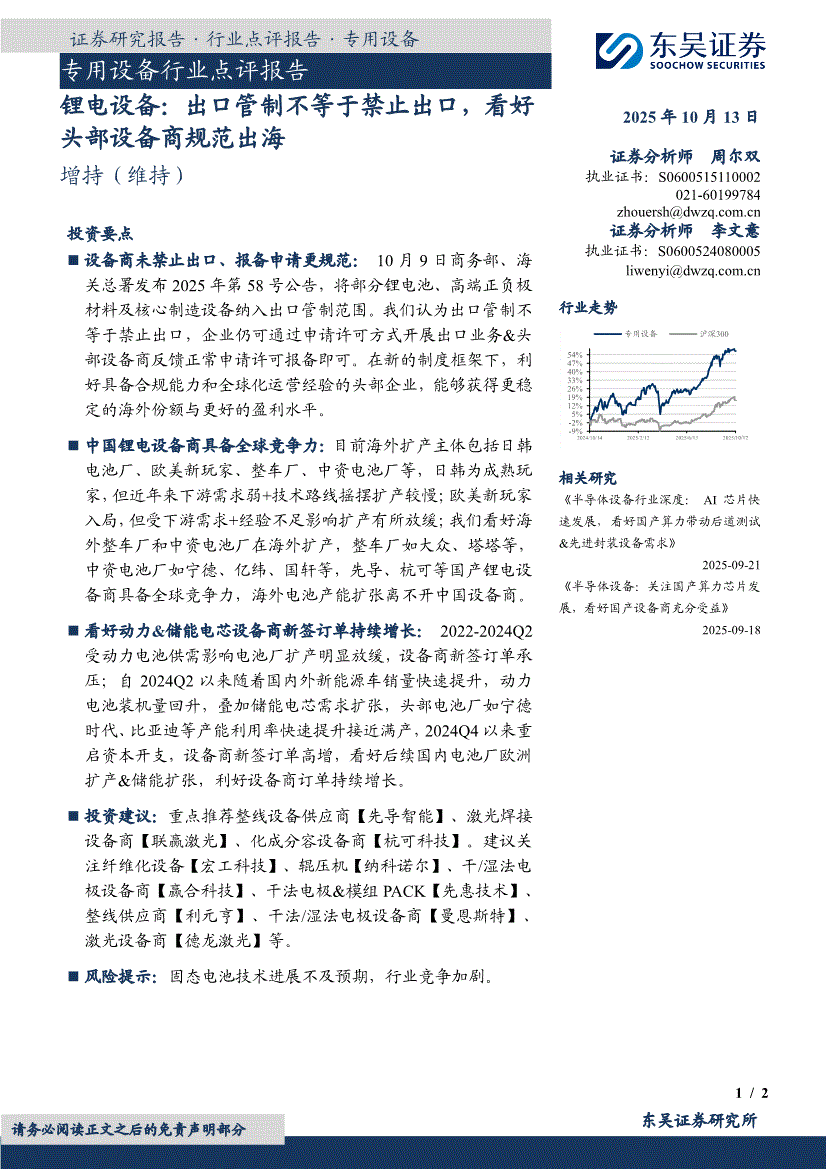 专用设备行业:东吴证券-专用设备行业点评报告:锂电设备,出口管制不等于禁止出口,看好头部设备商规范出海-251013