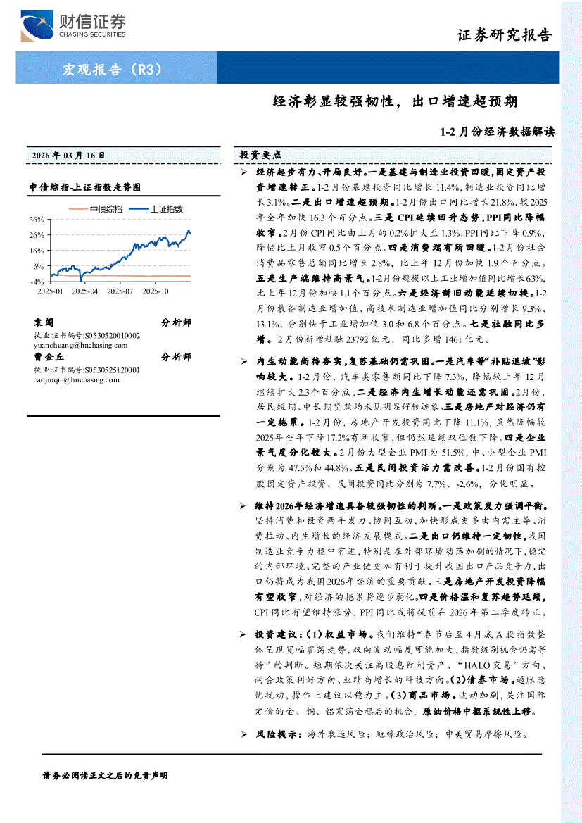 财信证券-1~2月份经济数据解读:经济彰显较强韧性,出口增速超预期-260316
