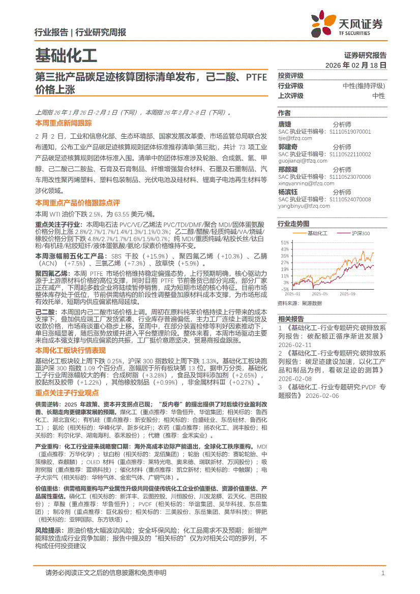 基础化工行业:天风证券-基础化工行业研究周报:第三批风产品碳足迹核算团标清单发布,己二酸、PTFE价格上涨-260218