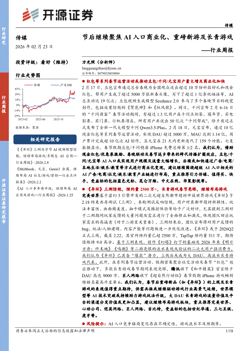 传媒行业:开源证券-传媒行业周报:节后继续聚焦AI入口商业化、重磅新游及长青游戏-260223