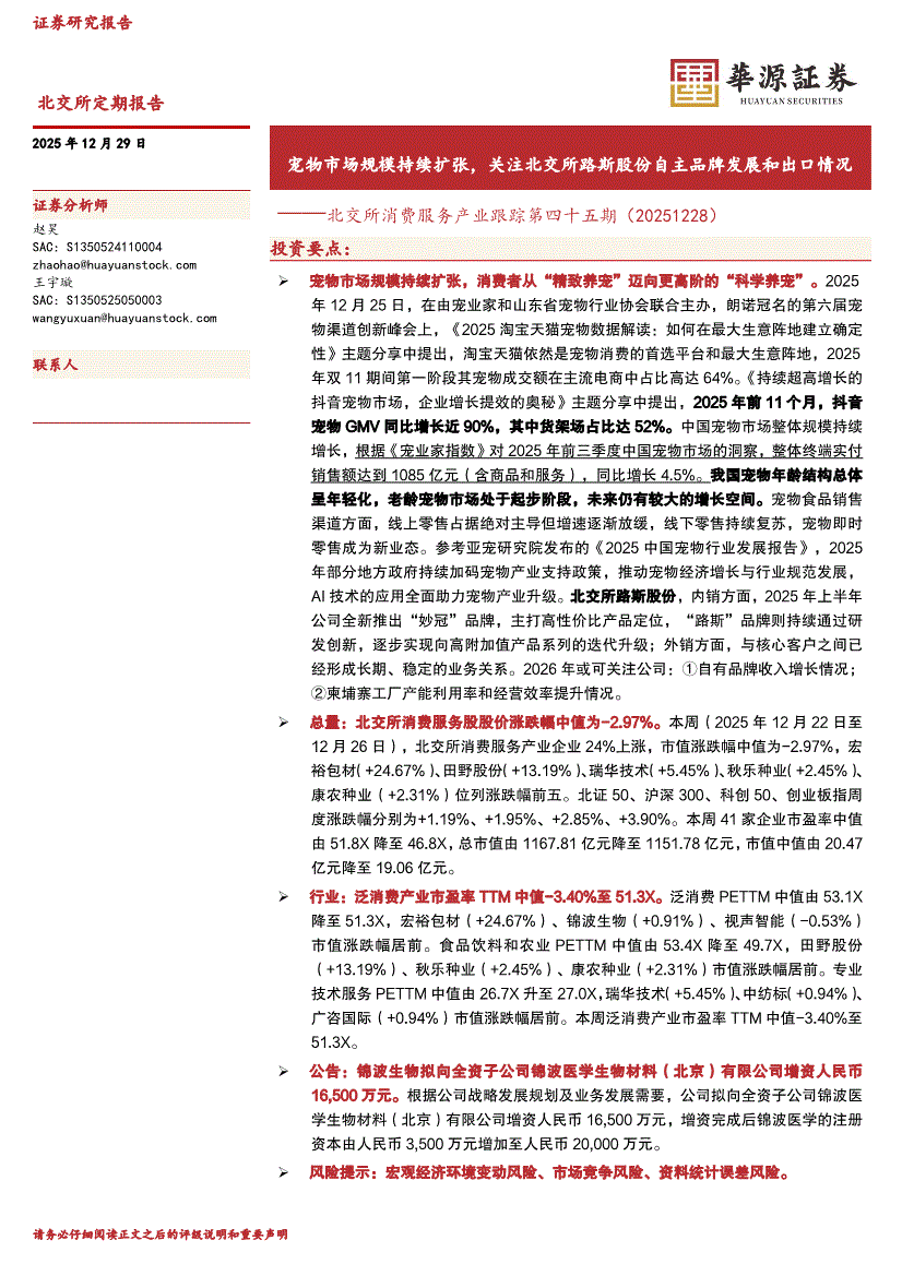 华源证券-北交所消费服务产业跟踪第四十五期:宠物市场规模持续扩张,关注北交所路斯股份自主品牌发展和出口情况-251229