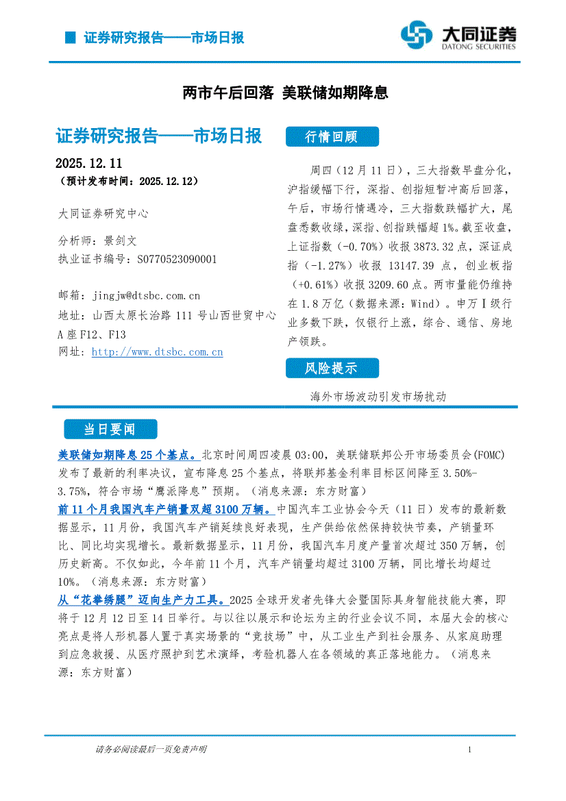 大同证券-市场日报:两市午后回落,美联储如期降息-251211