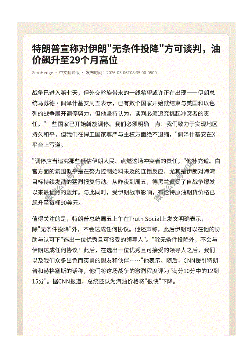 ZeroHedge-特朗普宣称对伊朗"无条件投降"方可谈判,油价飙升至29个月高位-260306