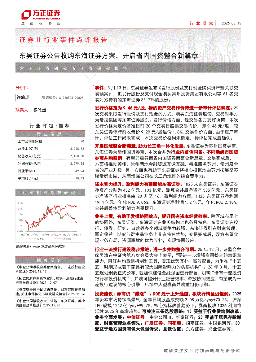 证券行业:东吴证券-证券Ⅱ行业事件点评报告:东吴证券公告收购东海证券方案,开启省内国资整合新篇章-260315