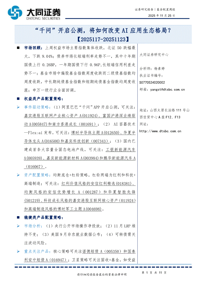 大同证券-基金配置周报:“千问”开启公测,将如何改变AI应用生态格局?-251125