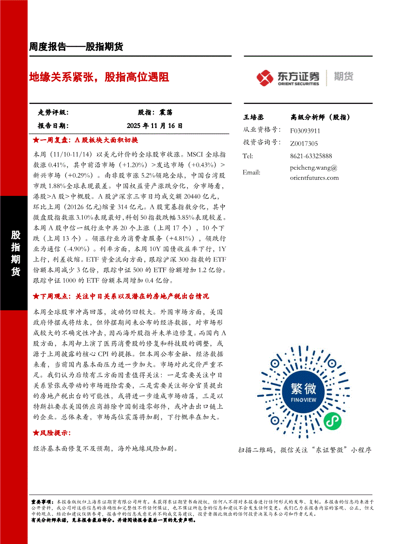 东证期货-股指期货周度报告:地缘关系紧张,股指高位遇阻-251116