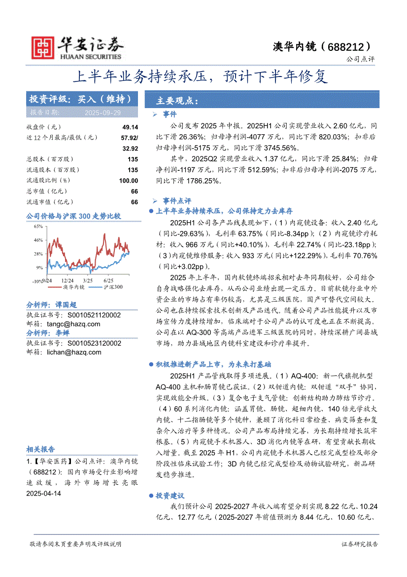 澳华内镜:华安证券-澳华内镜-688212-上半年业务持续承压,预计下半年修复-250929