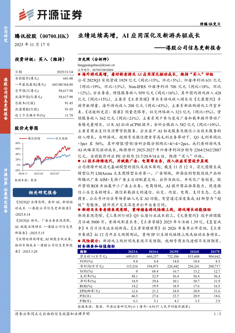 腾讯控股:开源证券-腾讯控股-0700.HK-港股公司信息更新报告:业绩延续高增,AI应用深化及新游共驱成长-251117