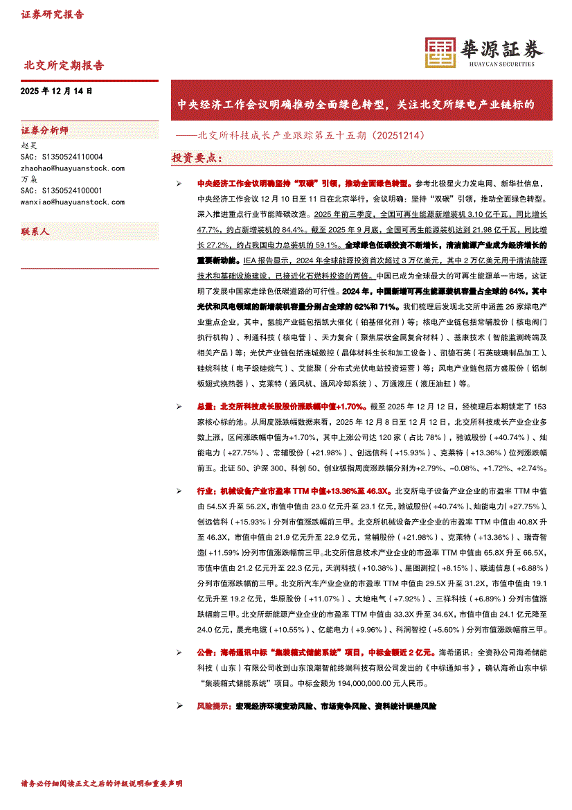 华源证券-北交所科技成长产业跟踪第五十五期:中央经济工作会议明确推动全面绿色转型,关注北交所绿电产业链标的-251214