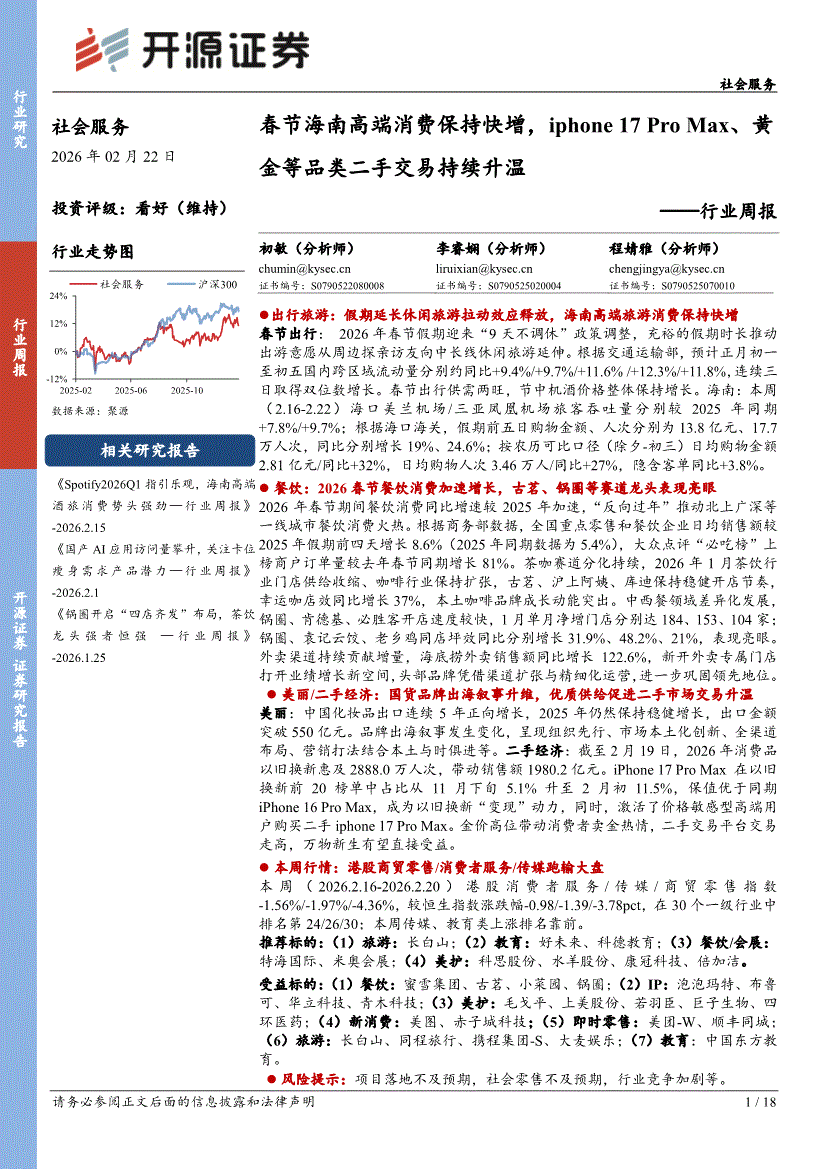 社会服务行业:开源证券-社会服务行业周报:春节海南高端消费保持快增,iphone 17 Pro Max、黄金等品类二手交易持续升温-260222