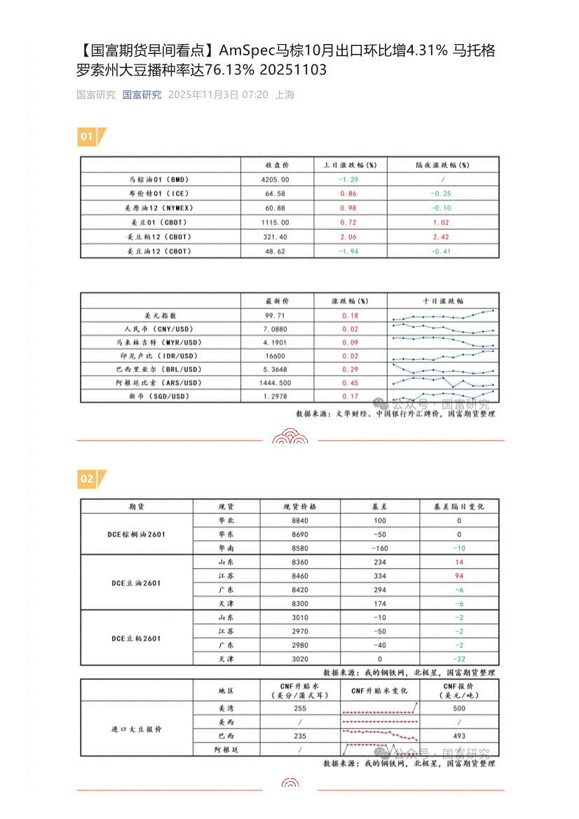 国富期货-【早间看点】AmSpec马棕10月出口环比增4.31%,马托格罗索州大豆播种率达76.13%-251103