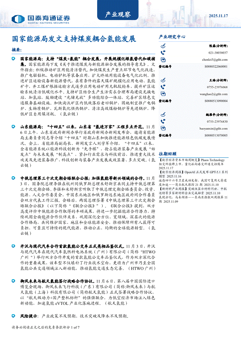 国泰海通证券-产业观察:国家能源局发文支持煤炭耦合氢能发展-251117
