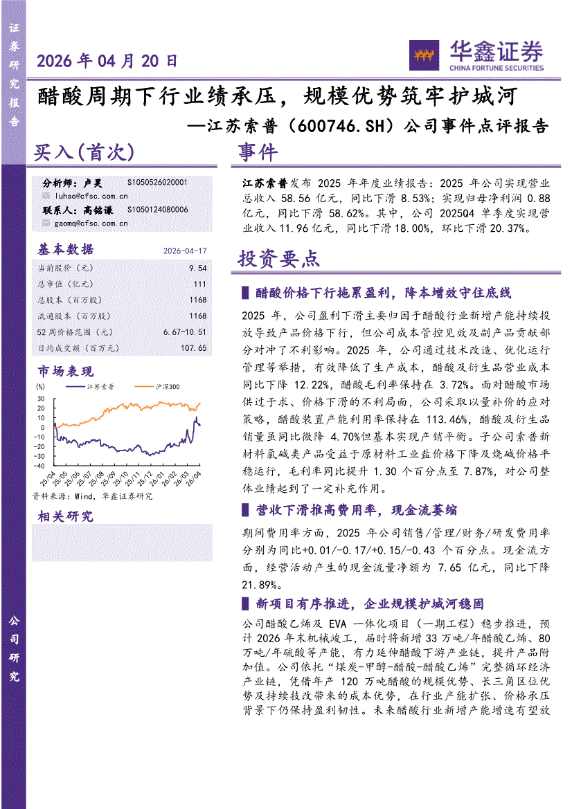 江苏索普:华鑫证券-江苏索普-600746-公司事件点评报告:醋酸周期下行业绩承压,规模优势筑牢护城河-260420