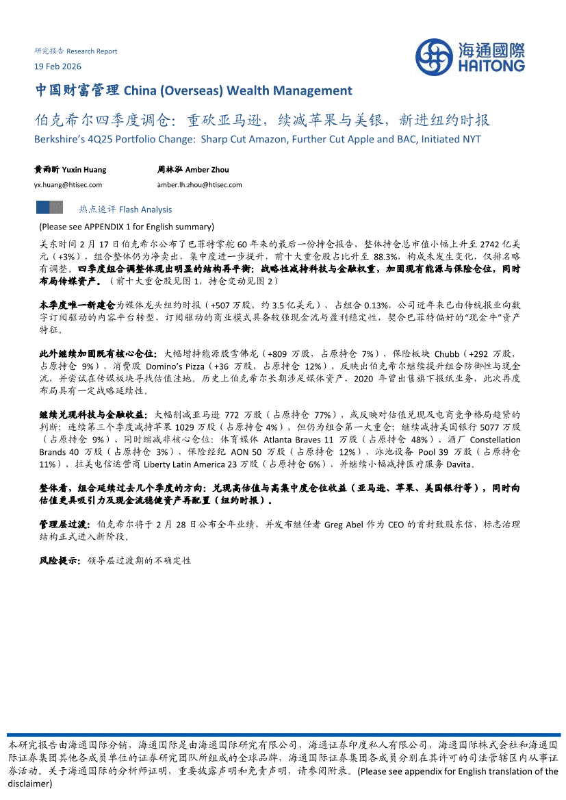 财富管理行业:海通国际-中国财富管理行业伯克希尔四季度调仓:重砍亚马逊,续减苹果与美银,新进纽约时报-260219