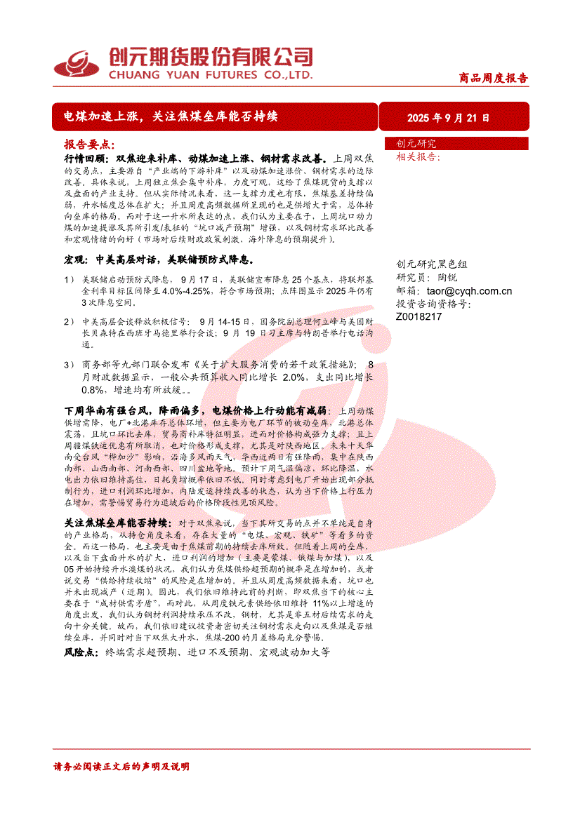 创元期货-商品周度报告:电煤加速上涨,关注焦煤垒库能否持续-250921