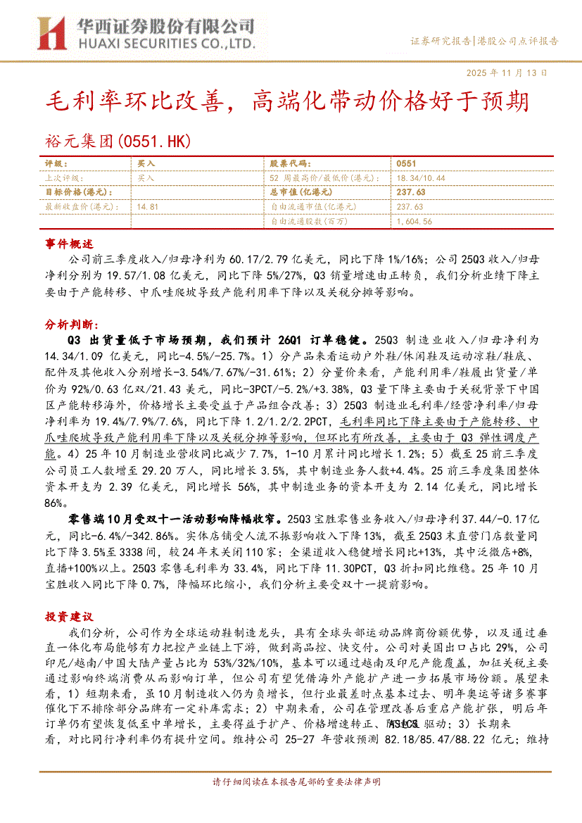 裕元集团:华西证券-裕元集团-0551.HK-毛利率环比改善,高端化带动价格好于预期-251113