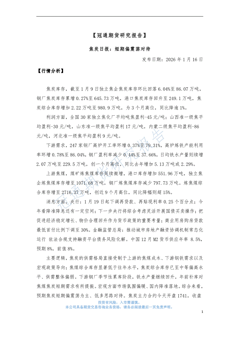 冠通期货-焦炭日报:短期偏震荡对待-260116