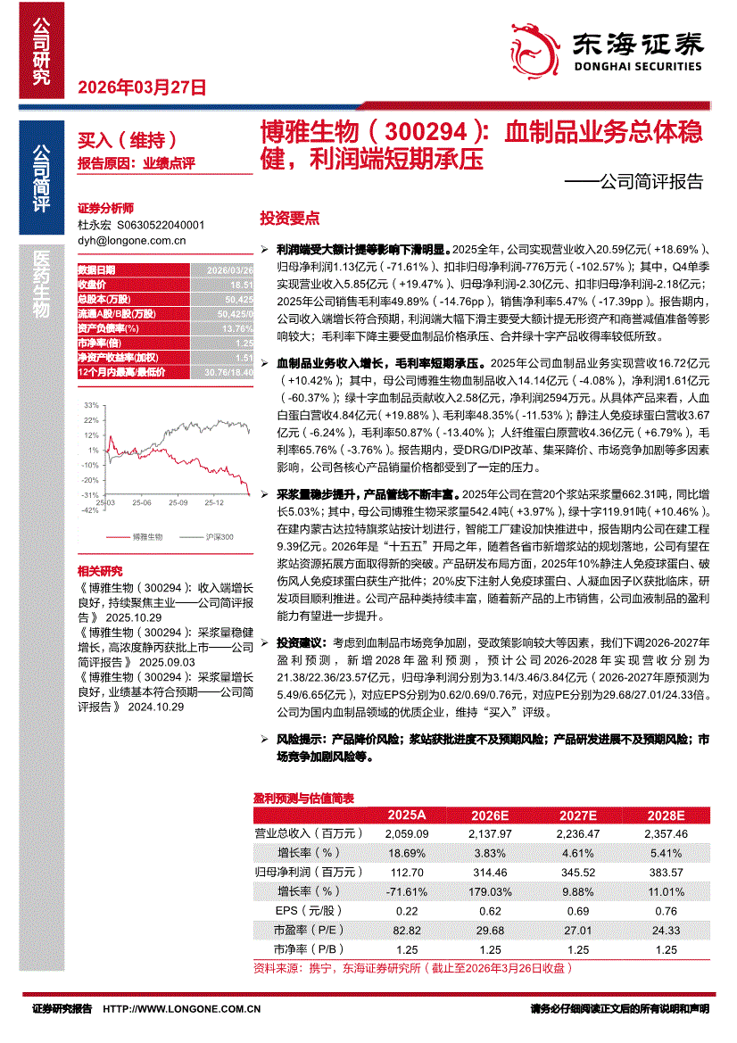 博雅生物:东海证券-博雅生物-300294-公司简评报告:血制品业务总体稳健,利润端短期承压-260327