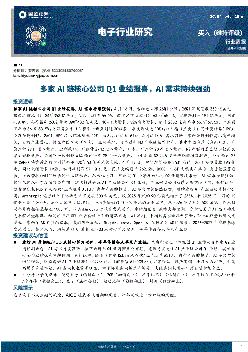 电子行业:国金证券-电子行业周报:多家AI链核心公司Q1业绩报喜,AI需求持续强劲-260419