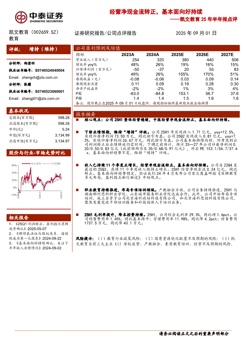凯文教育:中泰证券-凯文教育-002659-25年半年报点评:经营净现金流转正,基本面向好持续-250901