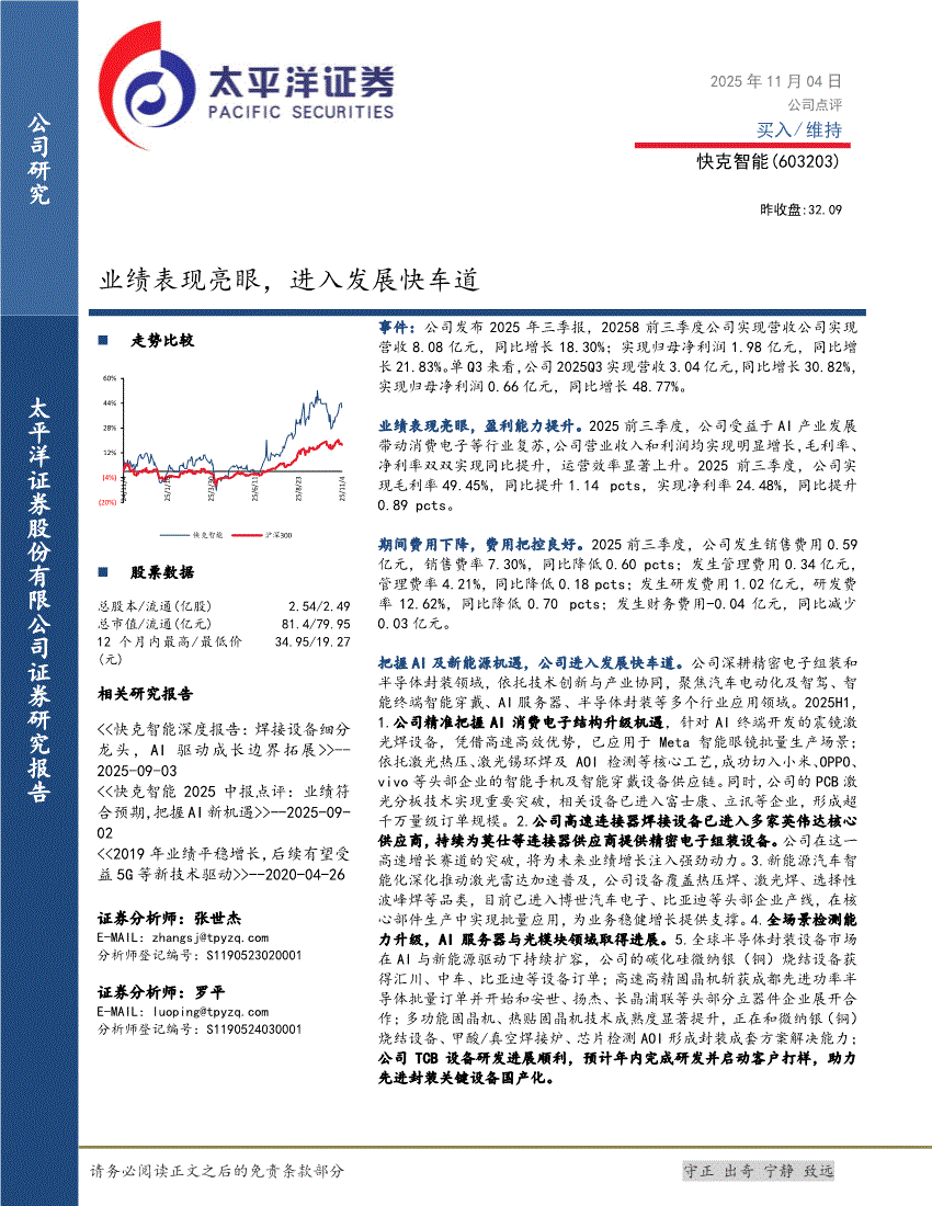 快克智能:太平洋证券-快克智能-603203-业绩表现亮眼,进入发展快车道-251104