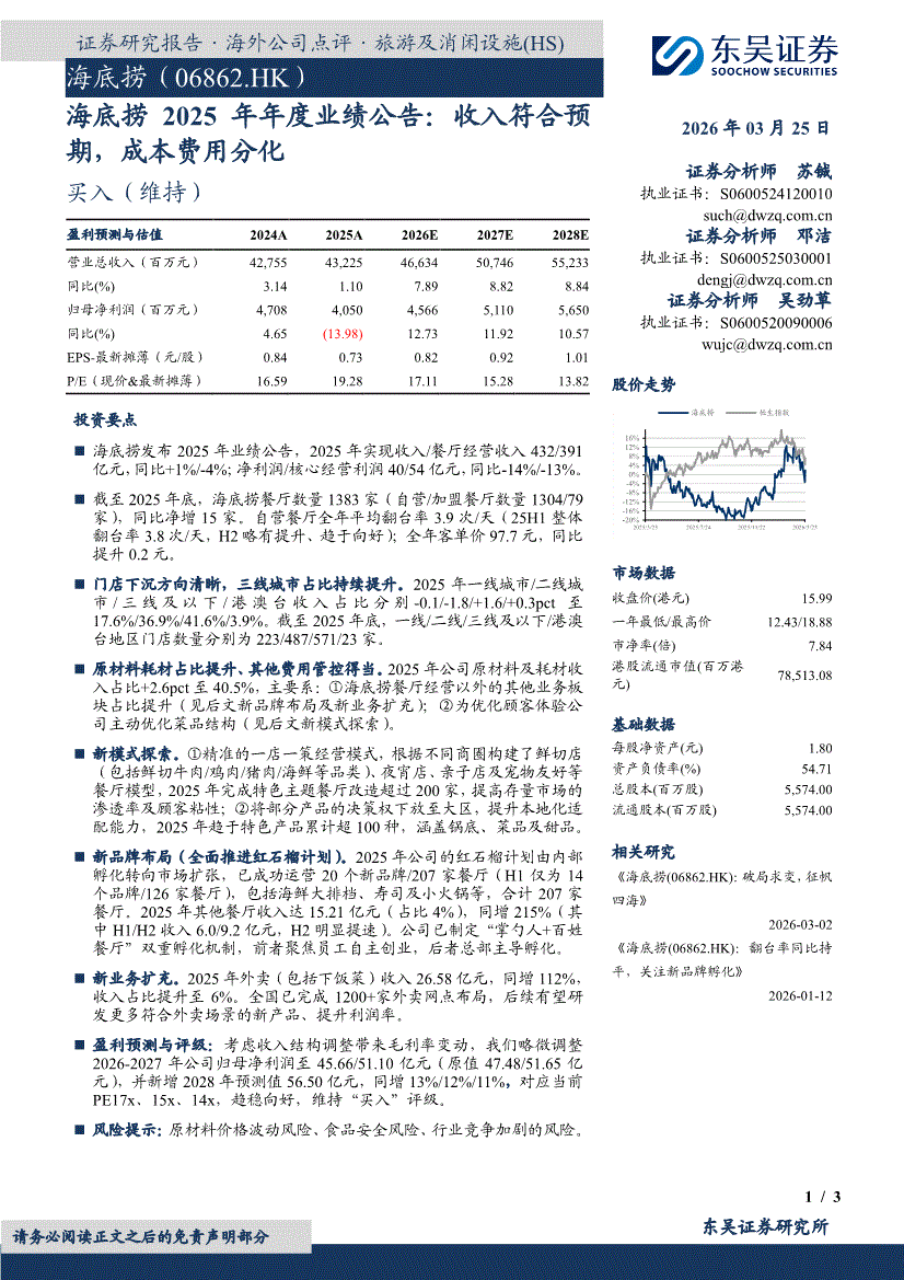 海底捞:东吴证券-海底捞-6862.HK-2025年年度业绩公告:收入符合预期,成本费用分化-260325