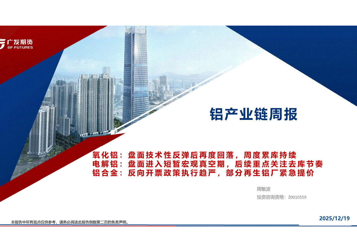 广发期货-铝产业链周报:氧化铝,盘面技术性反弹后再度回落,周度累库持续,电解铝,盘面进入短暂宏观真空期,后续重点关注去库节奏,铝合金,反向开票政策执行趋严,部分再生铝厂紧急提价-251219