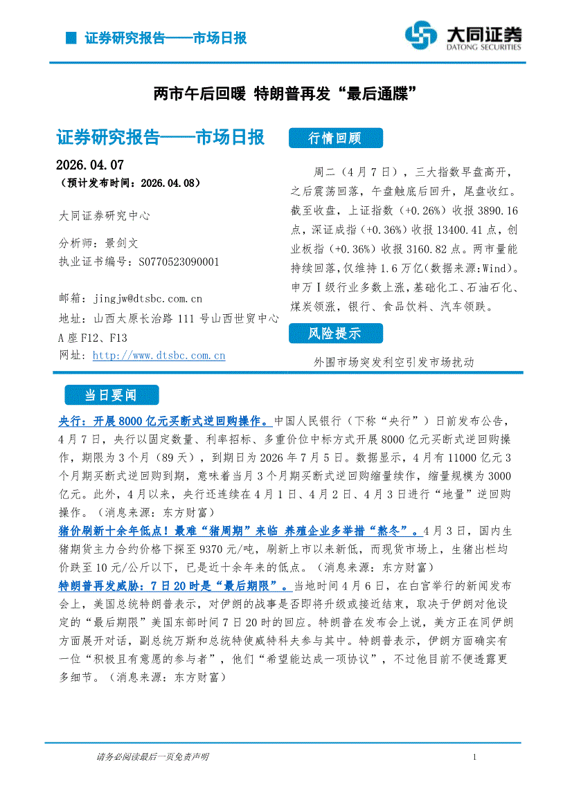 大同证券-市场日报:两市午后回暖,特朗普再发“最后通牒”-260407