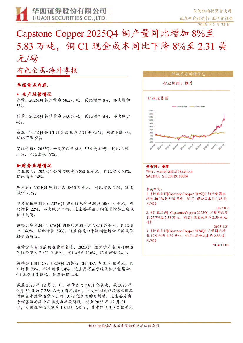 有色金属行业:华西证券-有色金属行业~海外季报:Capstone Copper2025Q4铜产量同比增加8%至5.83万吨,铜C1现金成本同比下降8%至2.31美元/磅-260323