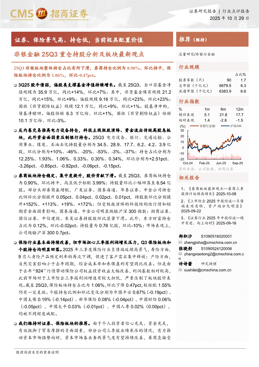非银金融行业:招商证券-非银金融行业25Q3重仓持股分析及板块最新观点:证券、保险景气高、持仓低,当前极具配置价值-251029