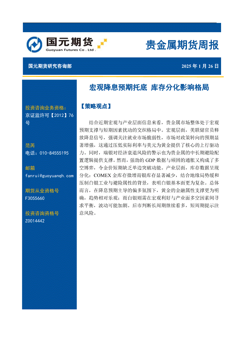 国元期货-贵金属期货周报:宏观降息预期托底,库存分化影响格局-260126