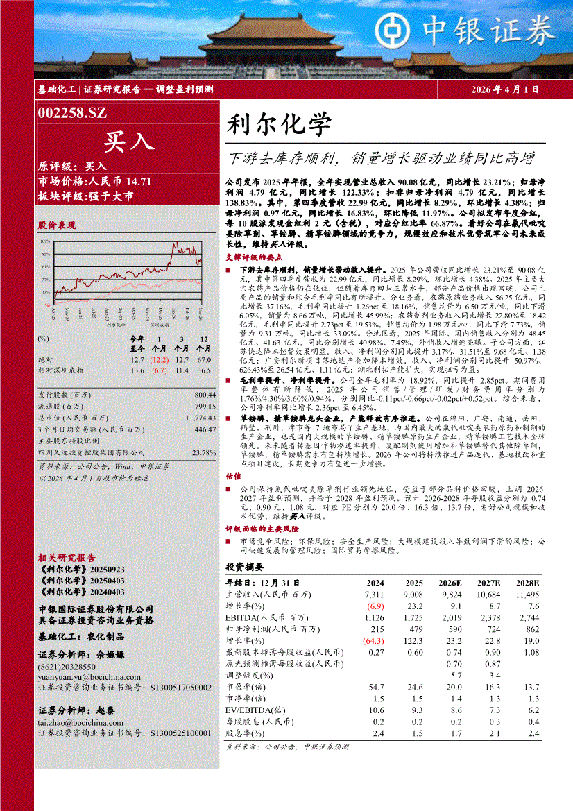 利尔化学:中银国际-利尔化学-002258-下游去库存顺利,销量增长驱动业绩同比高增-260401