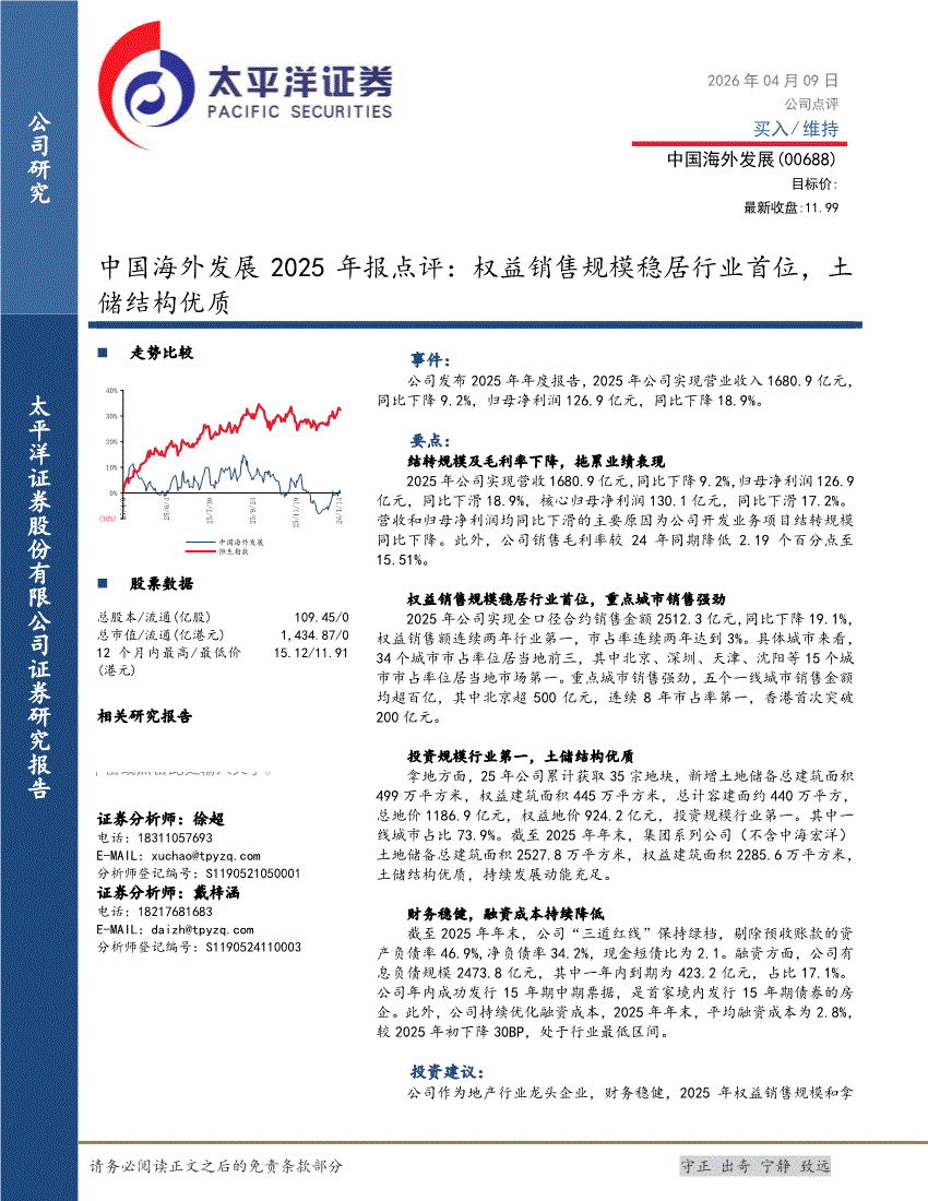 中国海外发展:太平洋证券-中国海外发展-0688.HK-2025年报点评:权益销售规模稳居行业首位,土储结构优质-260409