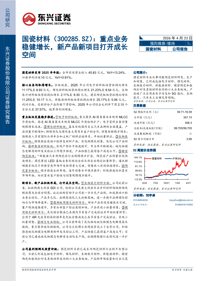 国瓷材料:东兴证券-国瓷材料-300285-重点业务稳健增长,新产品新项目打开成长空间-260423