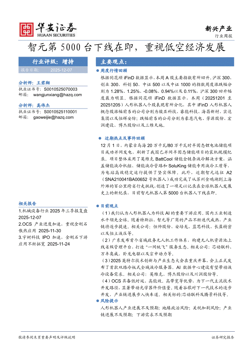机械设备行业:华安证券-机械设备行业周报:智元第5000台下线在即,重视低空经济发展-251207