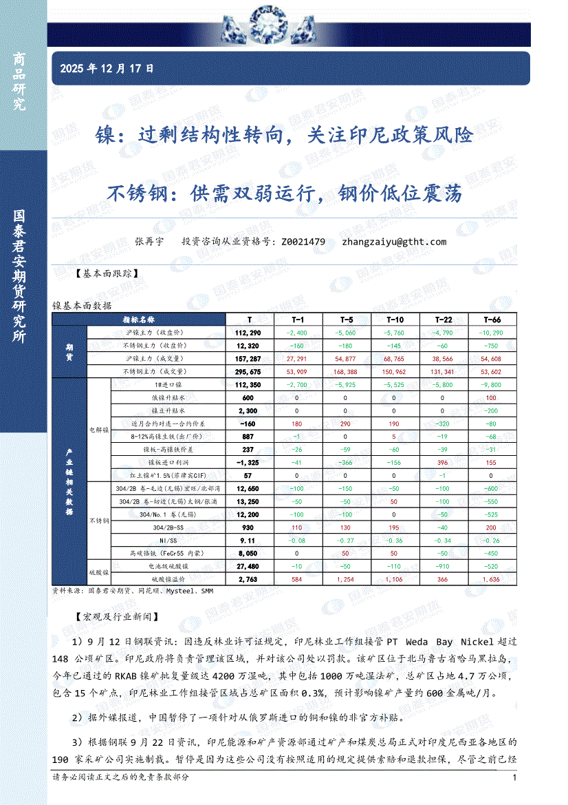 国泰君安期货-镍:过剩结构性转向,关注印尼政策风险,不锈钢,供需双弱运行,钢价低位震荡-251217