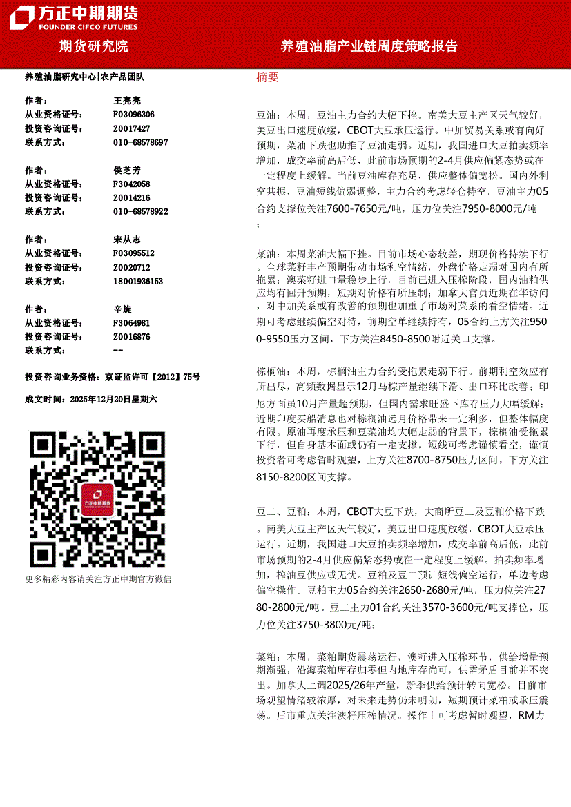 方正中期期货-养殖油脂产业链周度策略报告-251220
