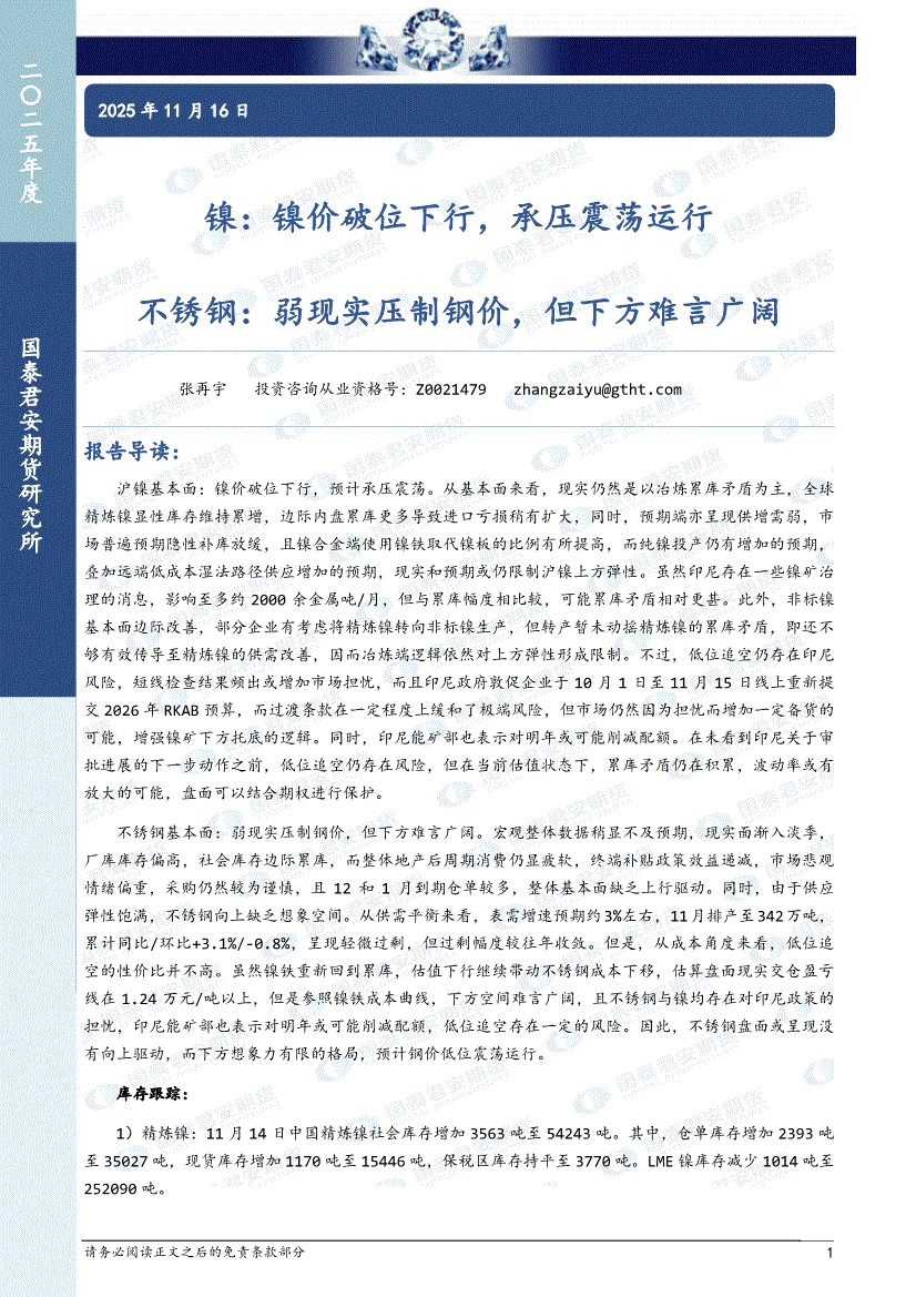 国泰君安期货-镍:冶炼端累库压制,矿端不确定性支撑,不锈钢,钢价低位窄幅震荡运行-251107