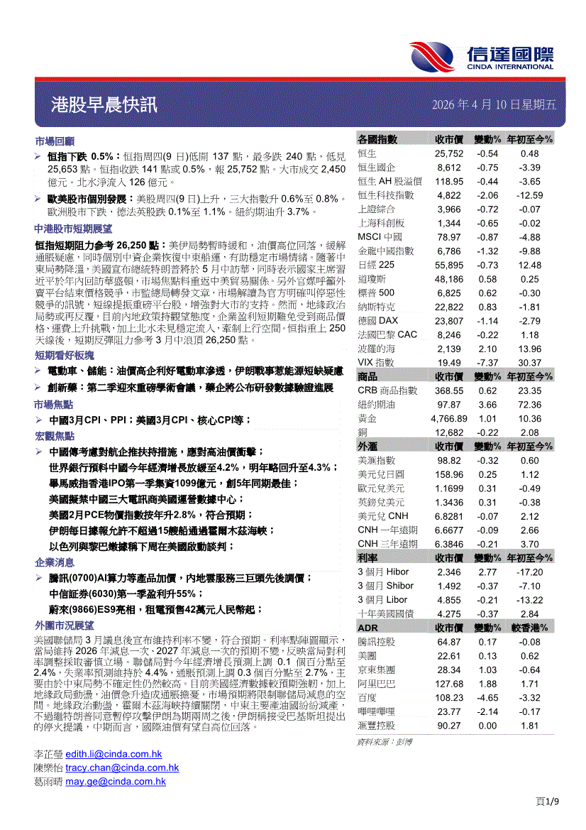 信达国际-港股早晨快讯-260410
