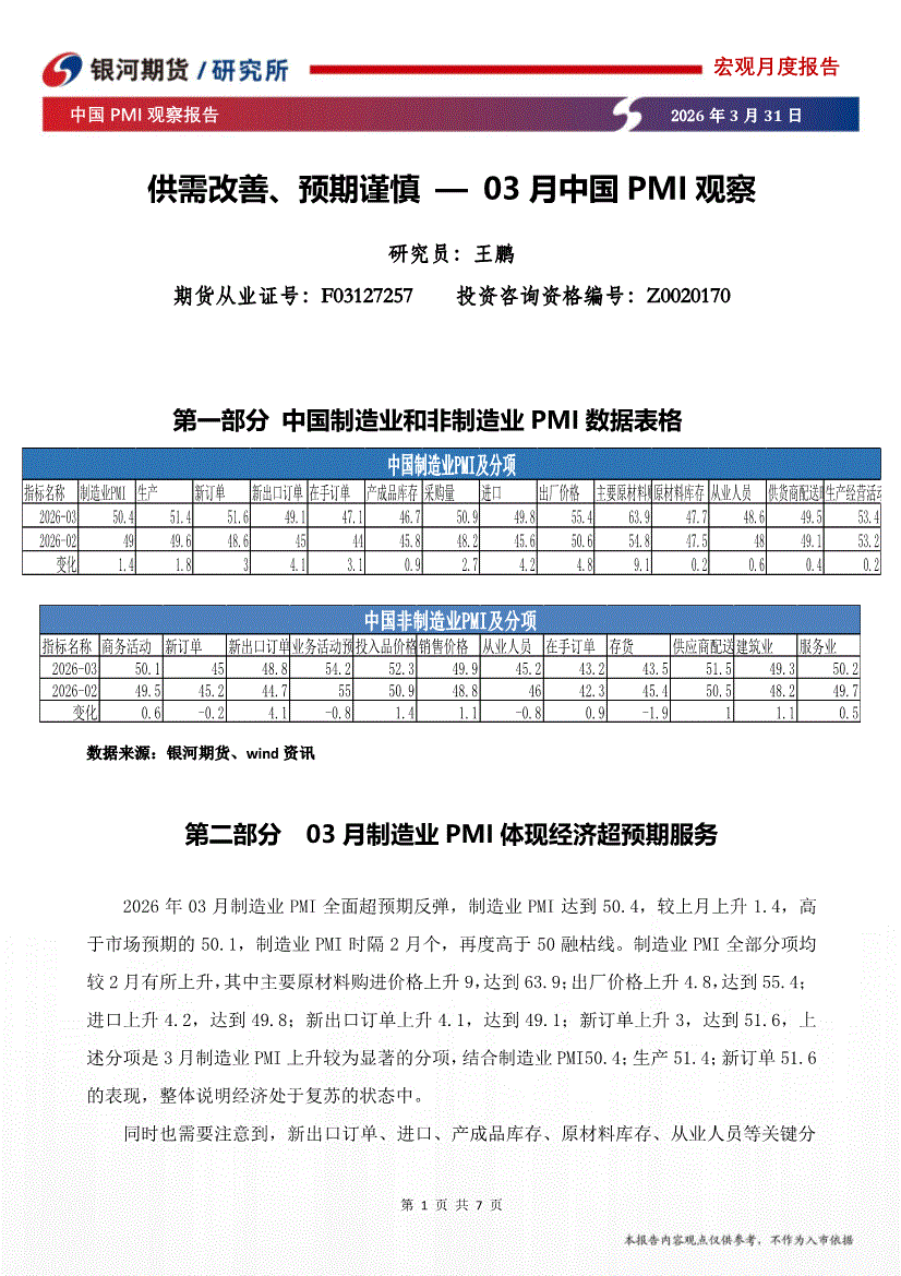 银河期货-03月中国PMI观察:供需改善、预期谨慎-260331
