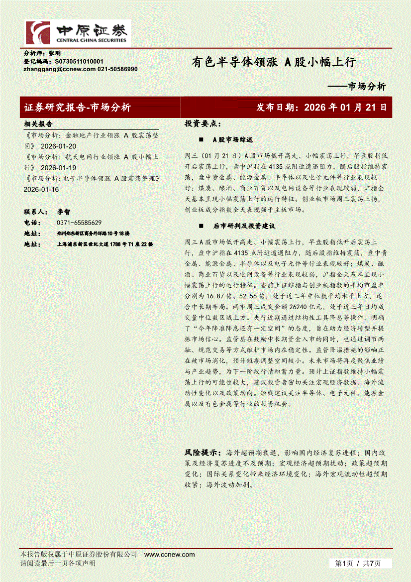 中原证券-市场分析:有色半导体领涨,A股小幅上行-260121