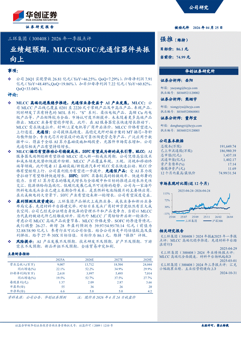 三环集团:华创证券-三环集团-300408-2026年一季报点评:业绩超预期,MLCC/SOFC/光通信器件共振向上-260425