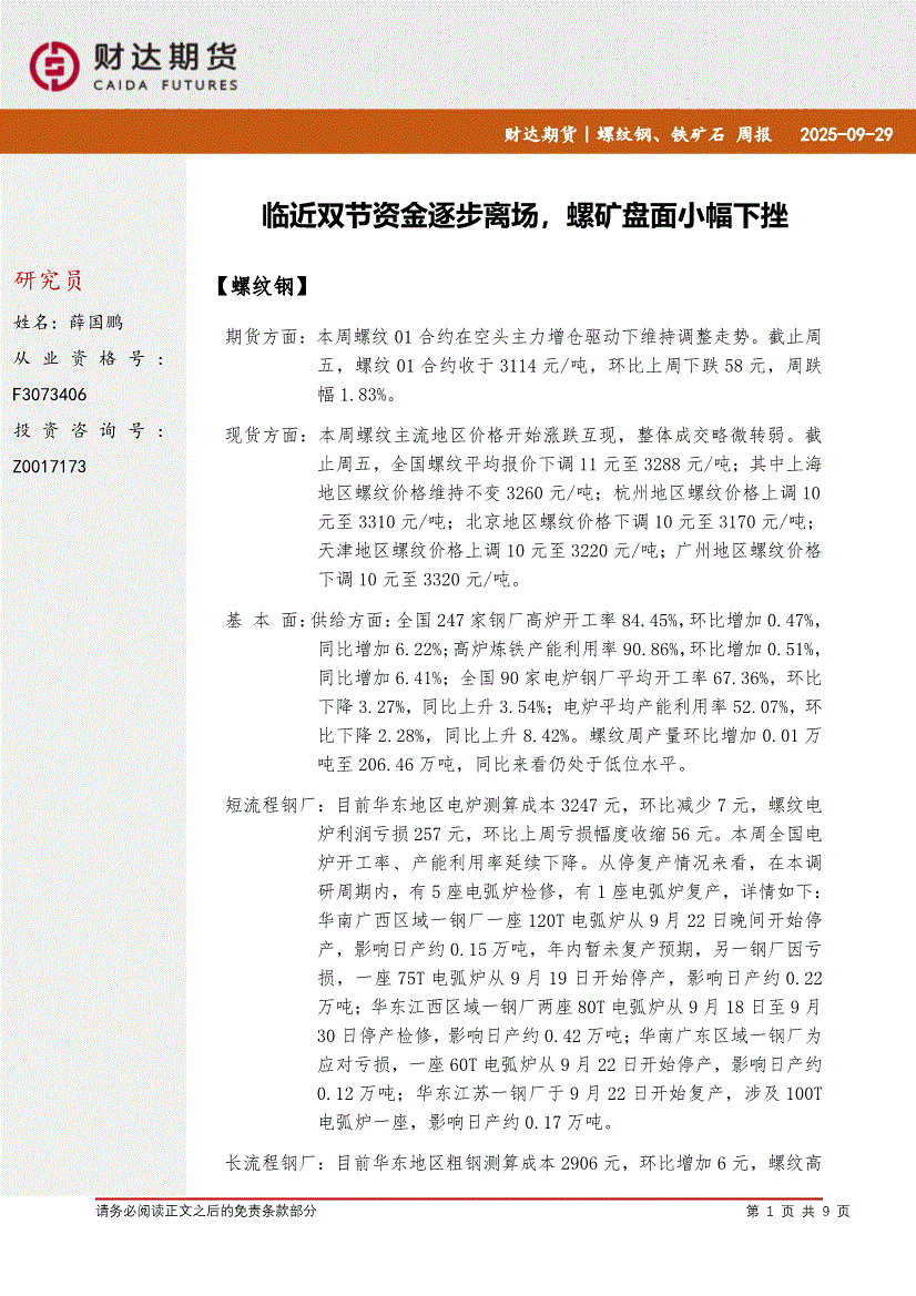 财达期货-螺纹钢、铁矿石周报:临近双节资金逐步离场,螺矿盘面小幅下挫-250929