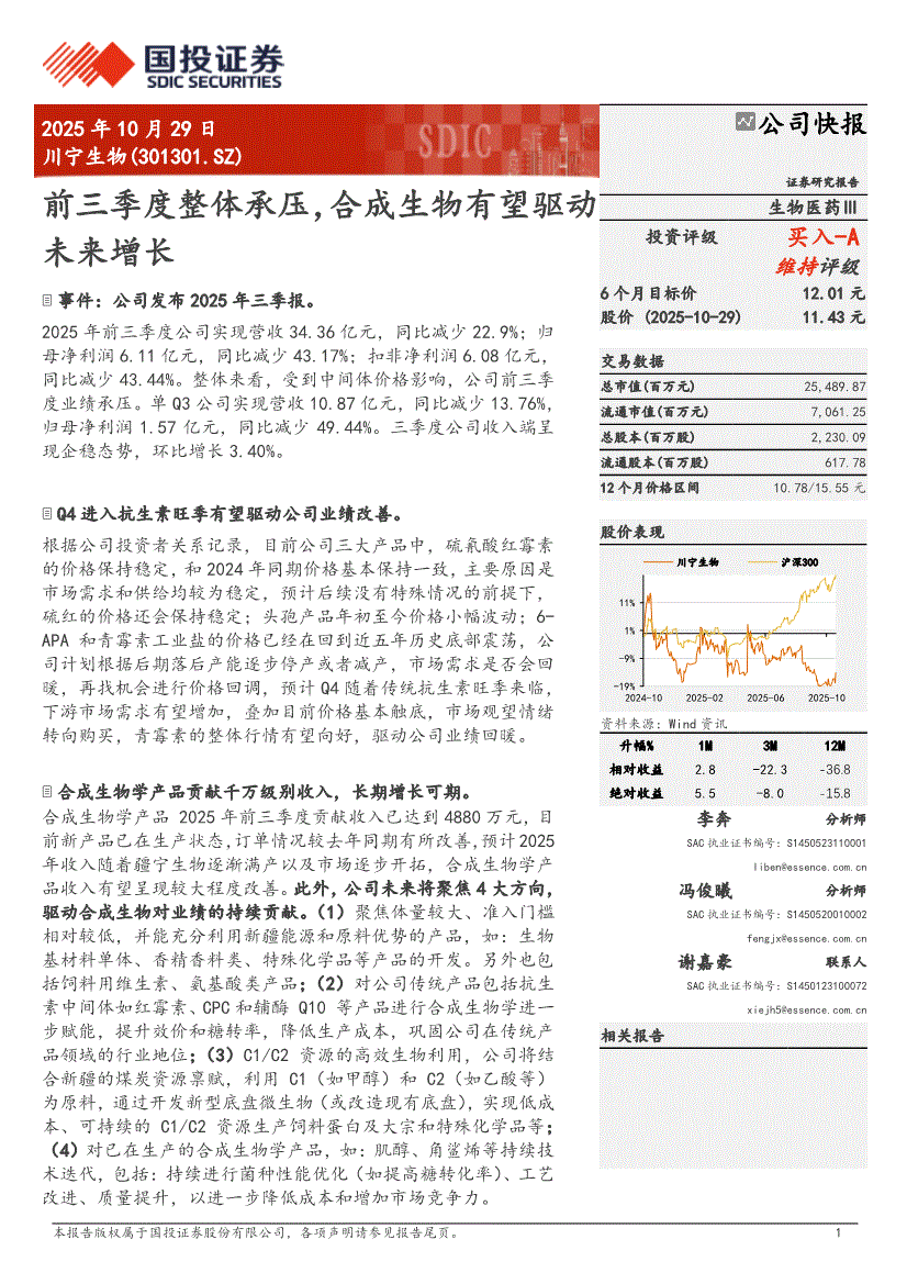 川宁生物:国投证券-川宁生物-301301-前三季度整体承压,合成生物有望驱动未来增长-251029