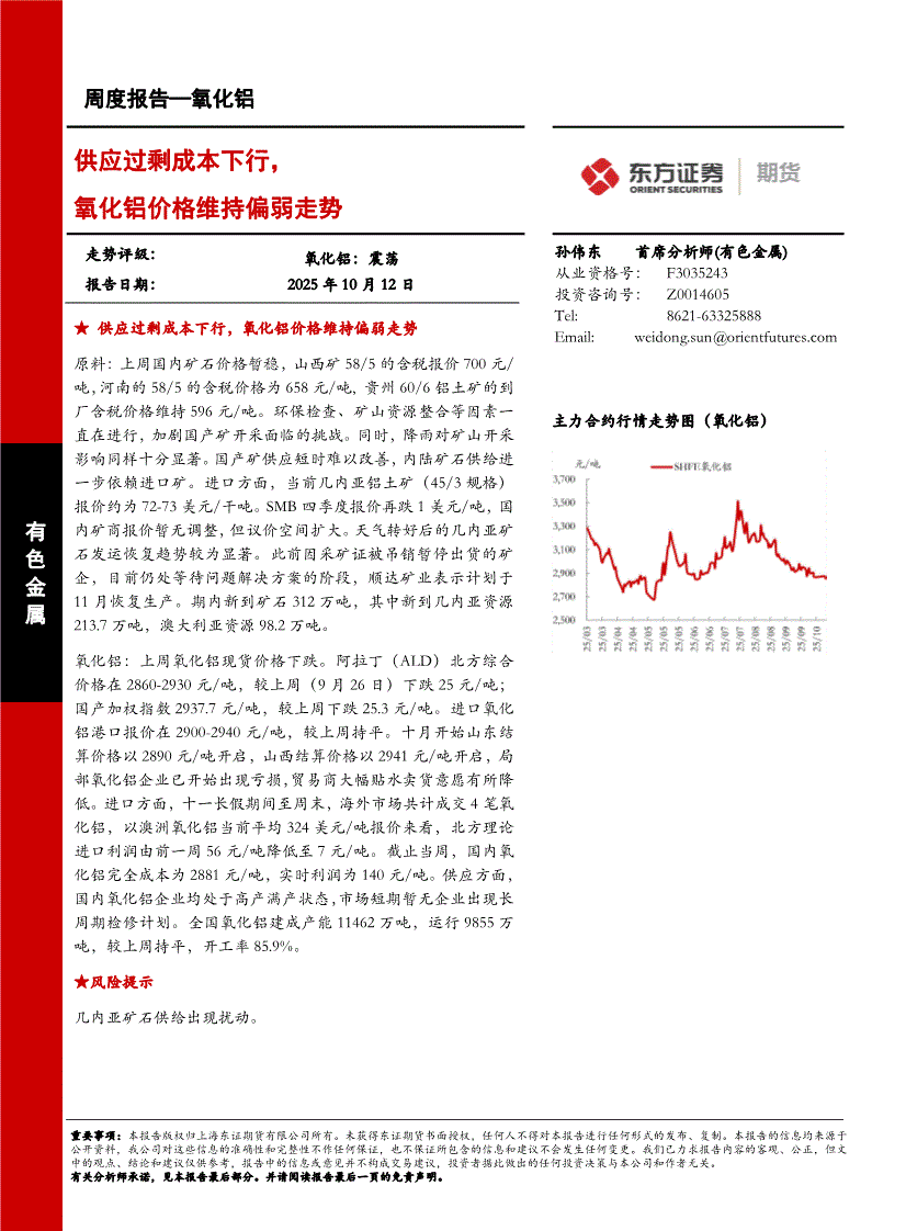东证期货-周度报告—氧化铝:供应过剩成本下行,氧化铝价格维持偏弱走势-251012