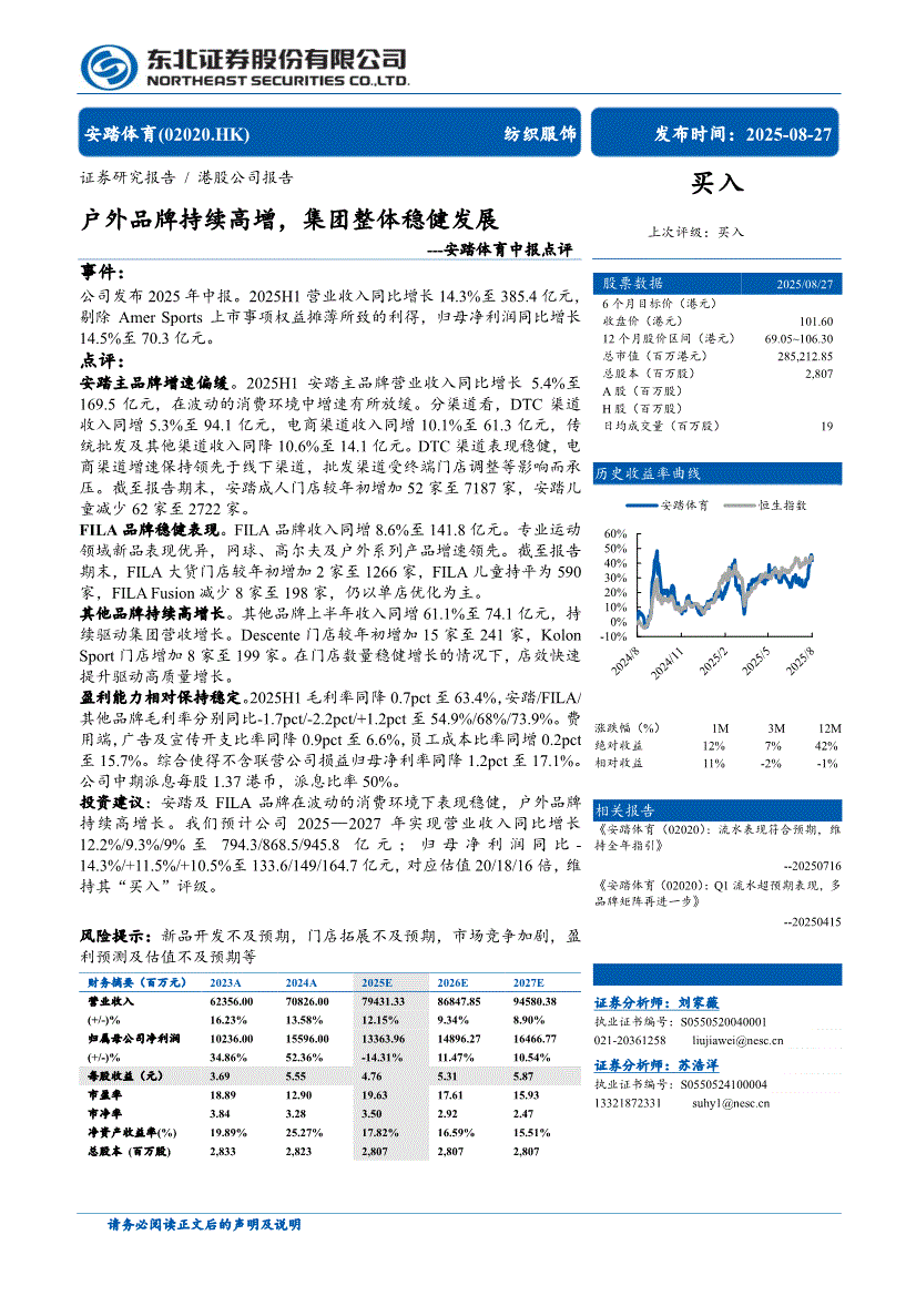 安踏体育:东北证券-安踏体育-2020.HK-中报点评:户外品牌持续高增,集团整体稳健发展-250827