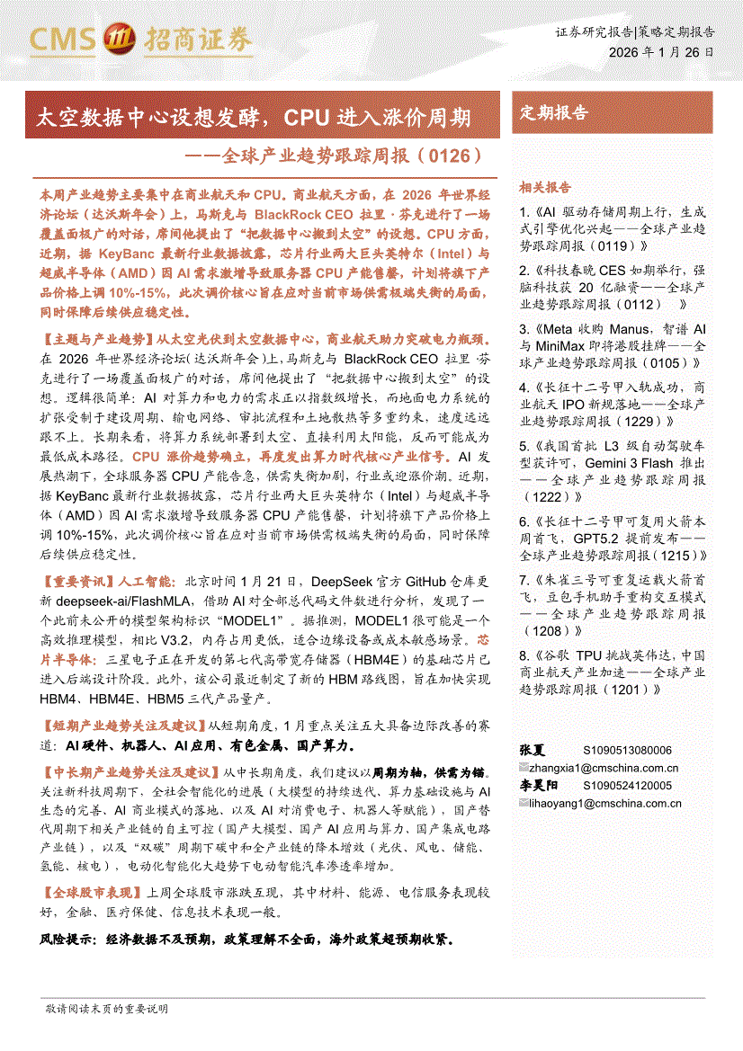招商证券-全球产业趋势跟踪周报:太空数据中心设想发酵,CPU进入涨价周期-260126
